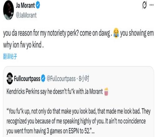 雷速体育10月28日宣 前NBA球员在一档播客节目中谈到莫兰特,帕金斯表示因为他一直在媒体上夸莫兰特,所以莫兰特才更加出名。