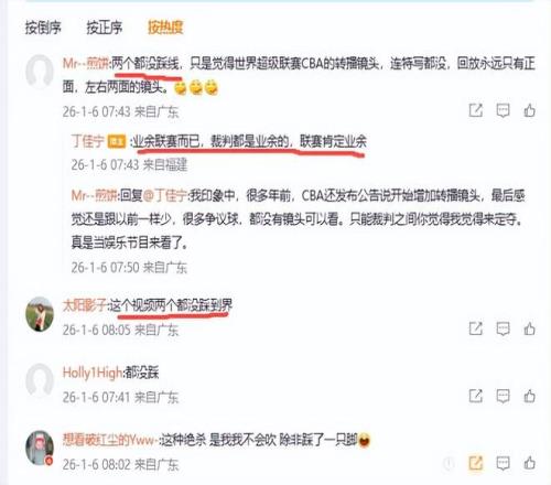 有球迷对此进行评论,“两个都没踩线,只是觉得世界超级联赛CBA的转播镜头,连特写都没,回放永远只有正面,左右两面的镜头。”丁佳宁与这位球迷互动时说:业余联赛而已,裁判都是业余的,联赛肯定业余。虽然丁佳宁没有直接说踩不踩线,但是他说的话显然认同了球迷的看法,那就是两人都没有踩线。